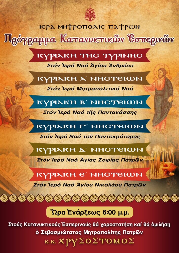 - Κατηχητικά: Σέ ὅλους τούς Ἱερούς Ναούς.