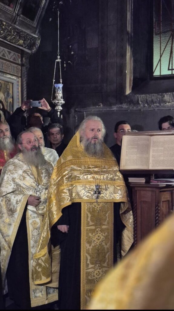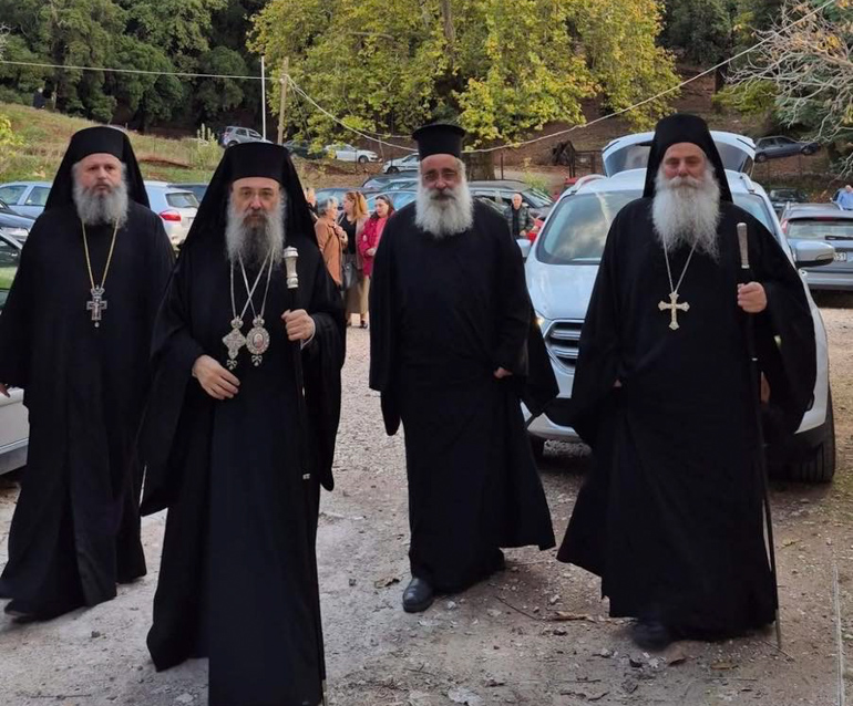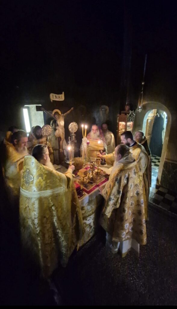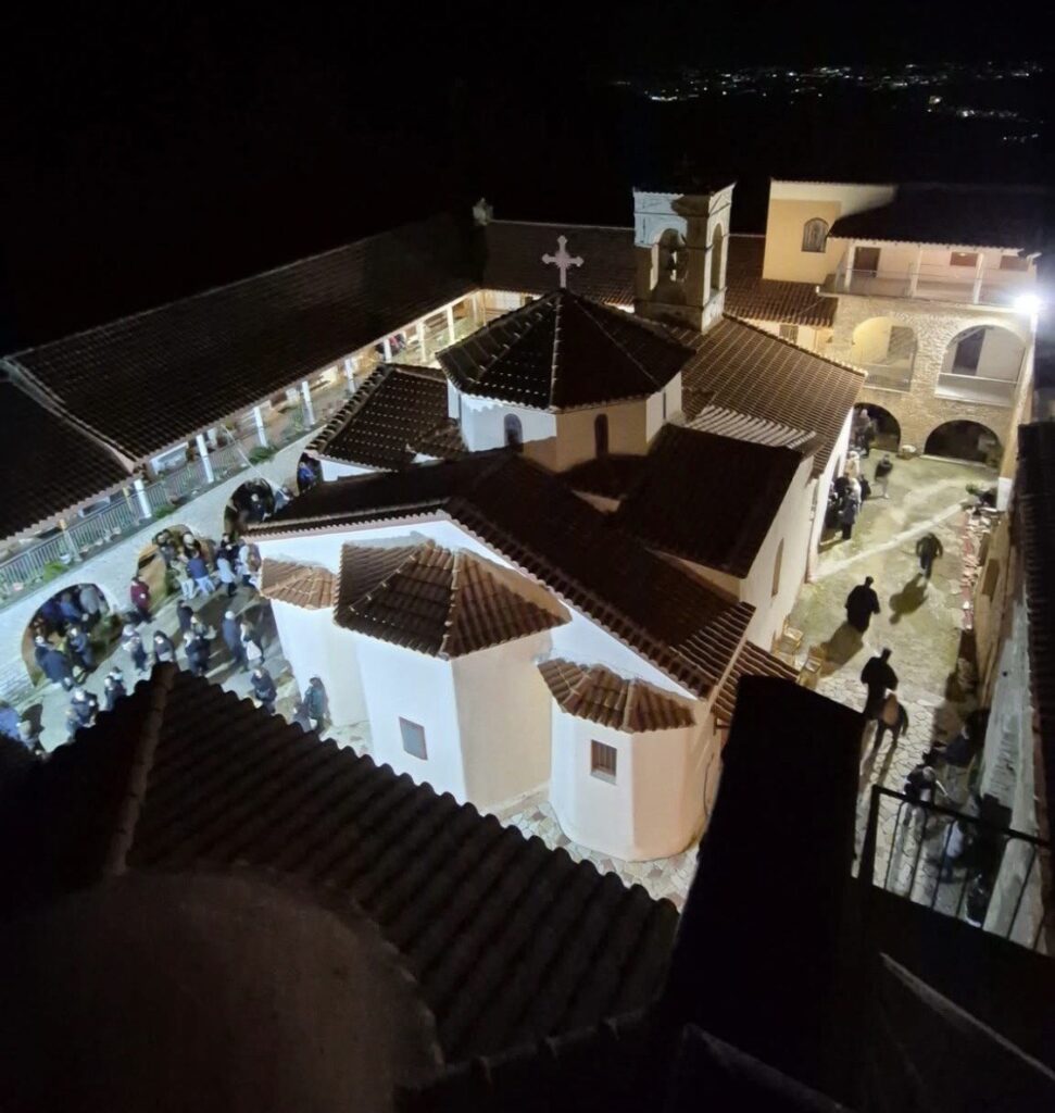 Στὸ Ἑσπερινὸ ἐχοροστάτησε ὁ Σεβασμιώτατος Μητροπολίτης Πατρῶν κ.κ. Χρυσόστομος, τὸν ὁποῖον ὑπεδέχθη ἡ Ἀδελφότης τῆς Ἱερᾶς Μονῆς ὑπό τον Καθηγούμενον π. Νεκτάριον.