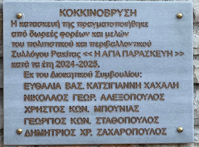 «Κοκκινόβρυση.Ἡ κατασκευή της πραγματοποιήθηκε ἀπό δωρεές φορέων καί μελῶν τοῦ Πολιτιστικοῦ καί Περιβαλλοντικοῦ Συλλόγου Ρακίτας «Ἡ Ἁγία Παρασκευή κατά τά ἒτη 2024-2025.